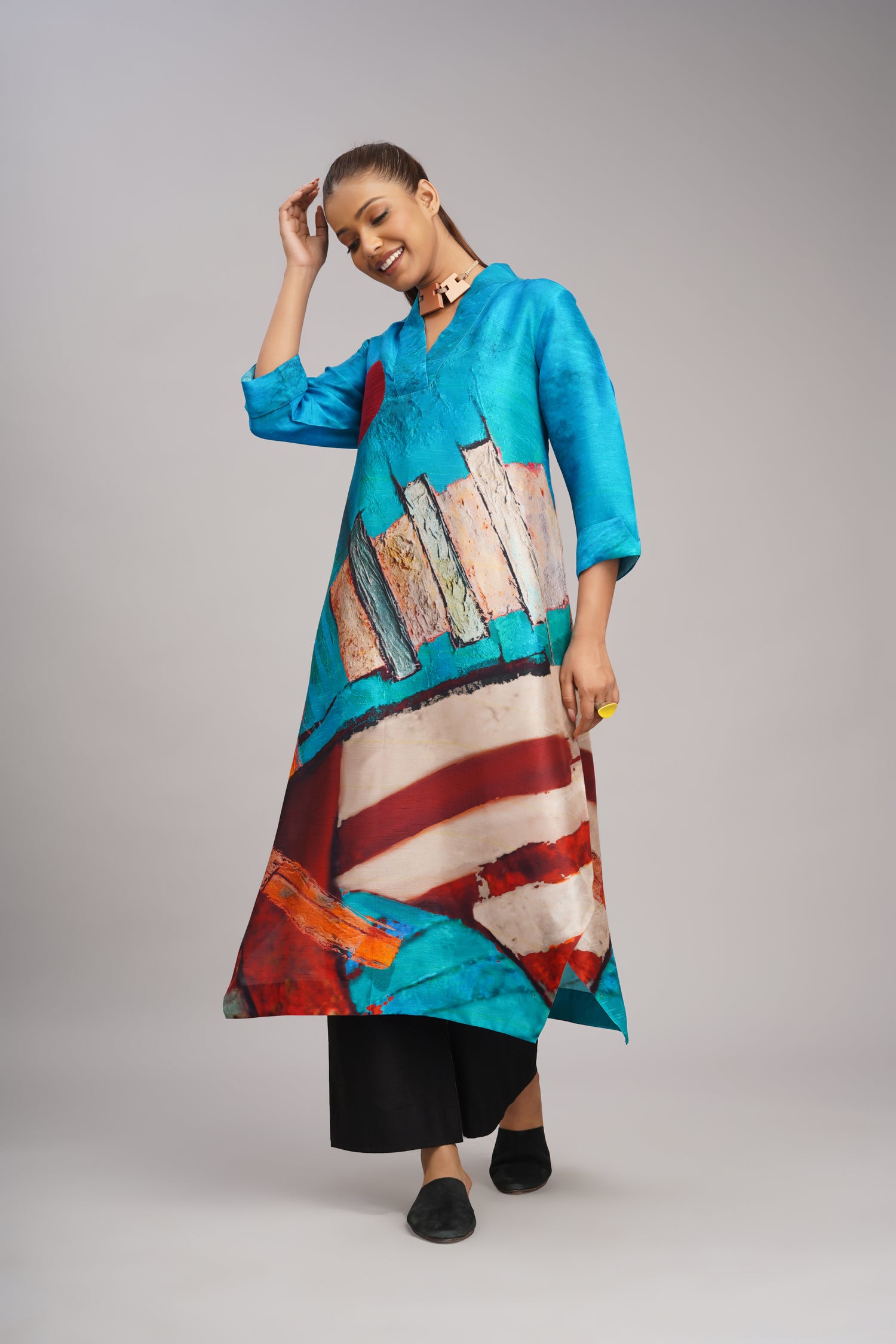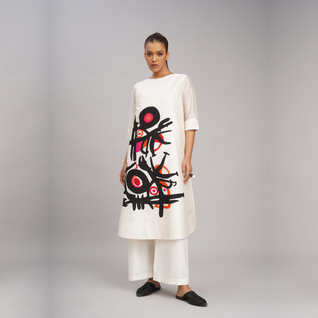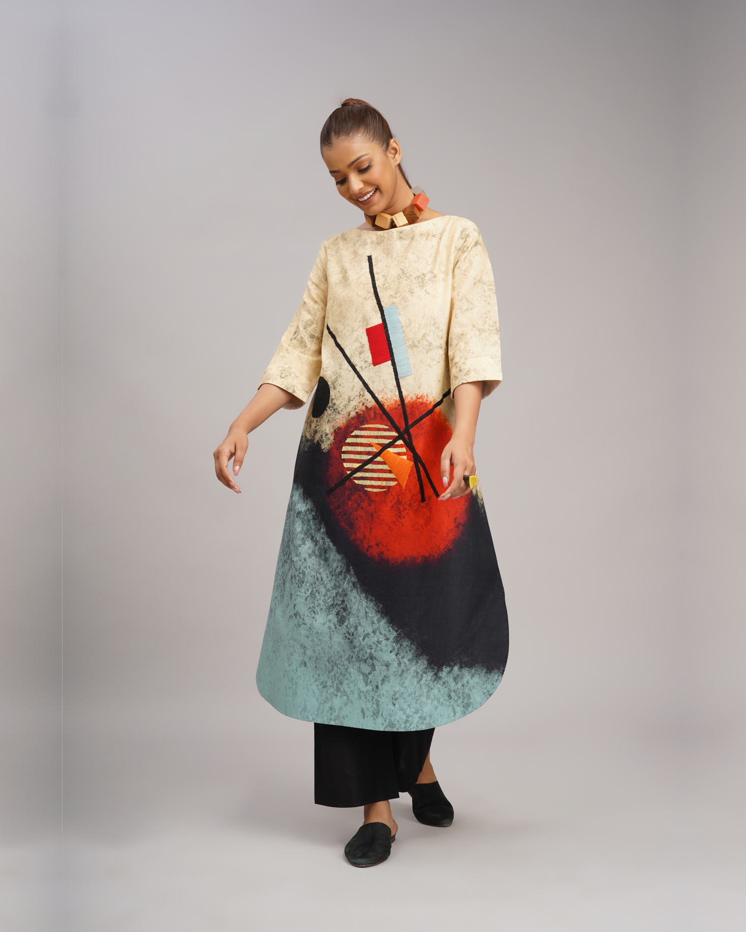 "Abstract printed tunic with detailed embroidery work, perfect for creating a standout...