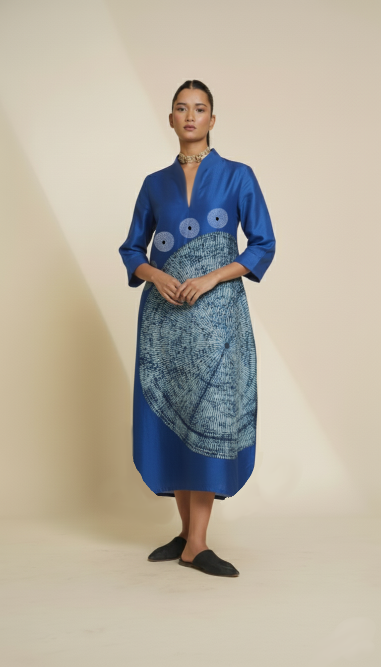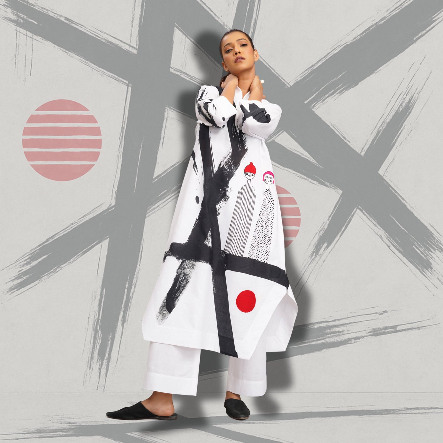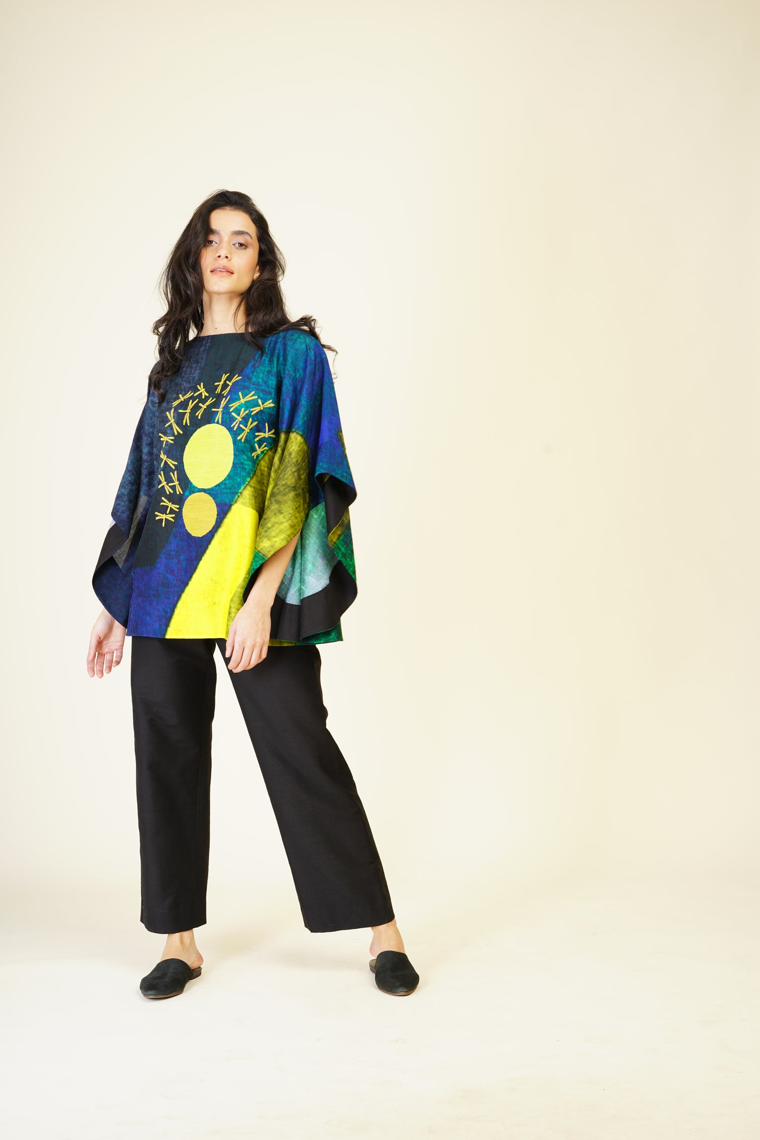 "Abstract printed tunic with detailed embroidery work, perfect for creating a standout...