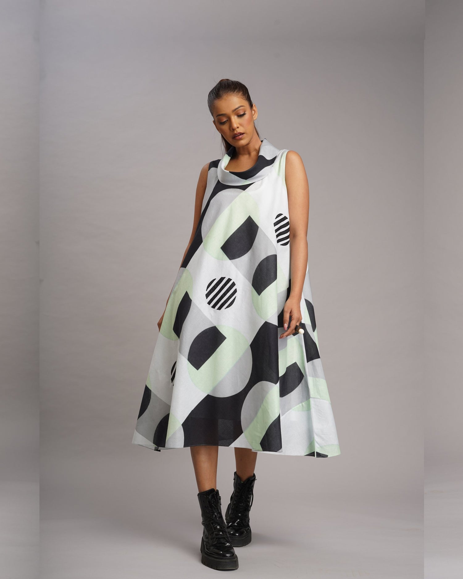A modern, sculptural silhouette with a playful use of geometric patterns which...