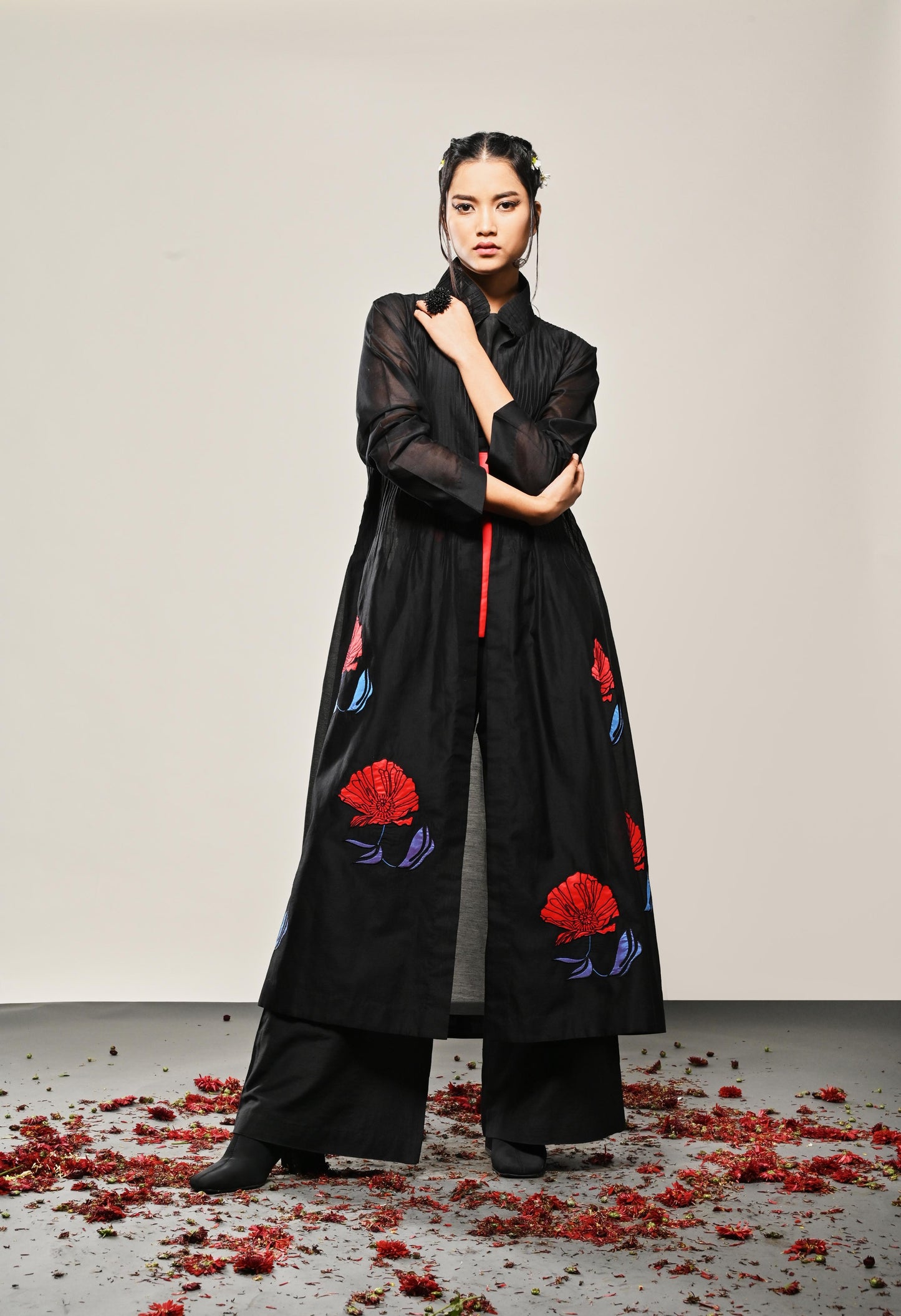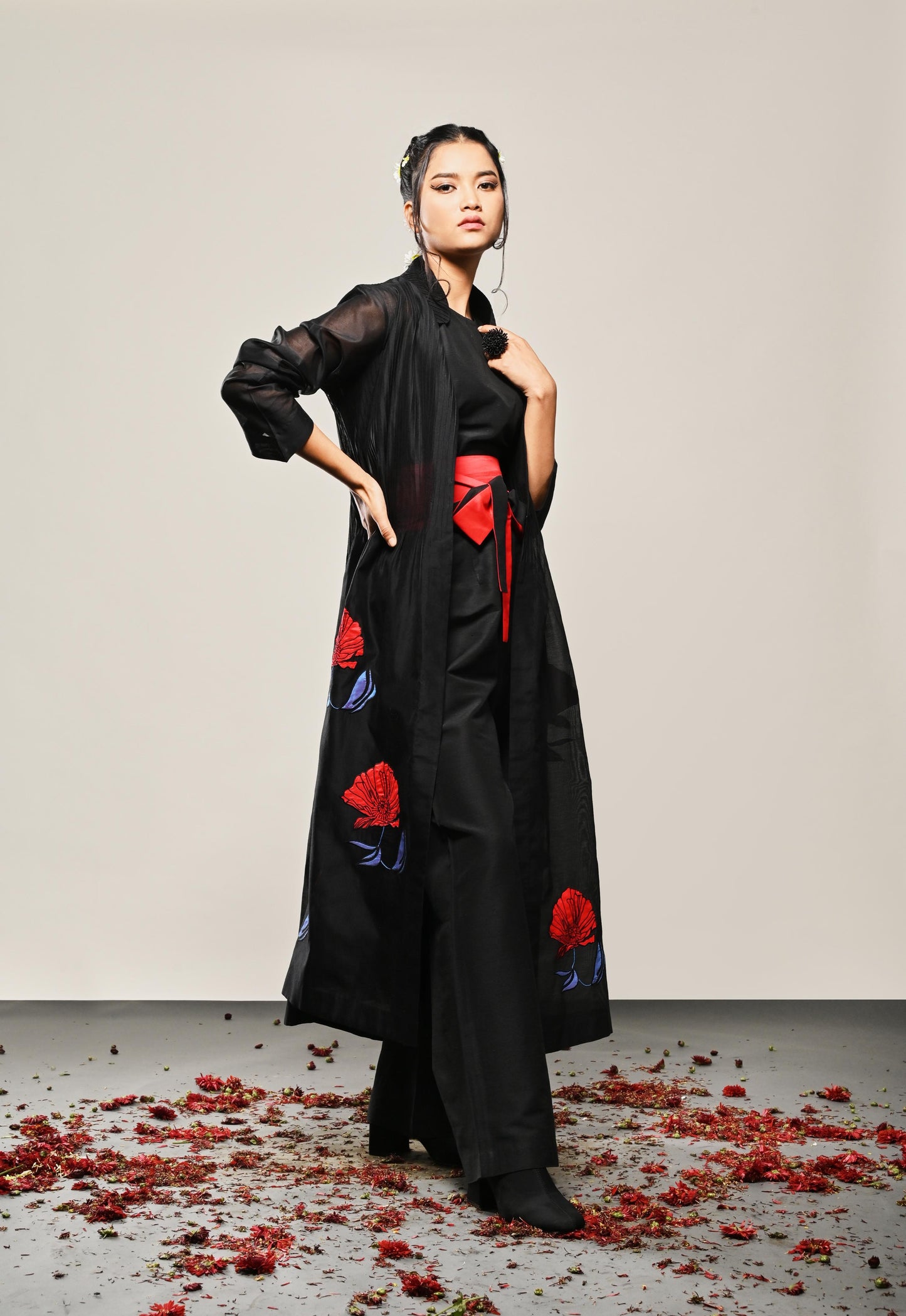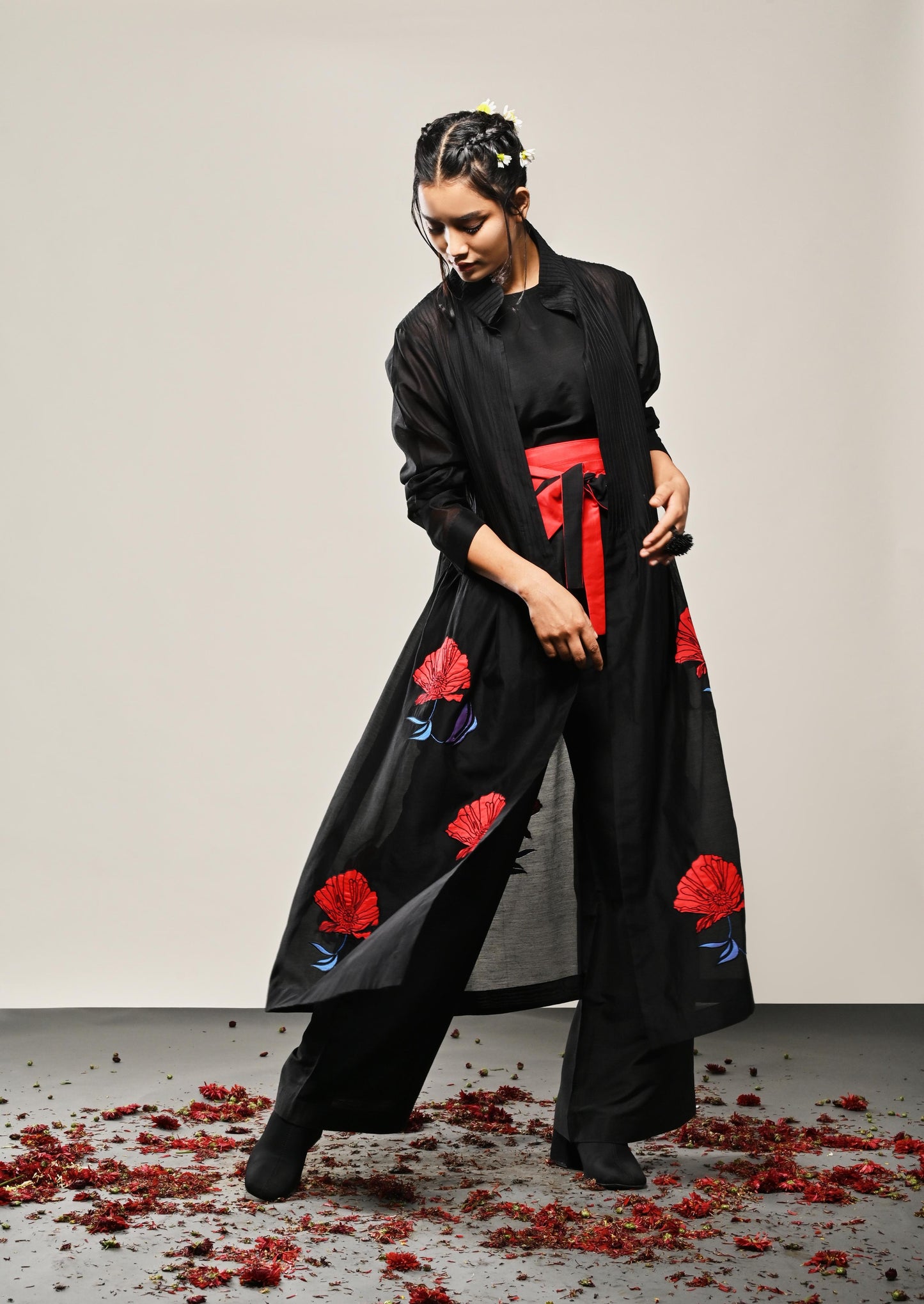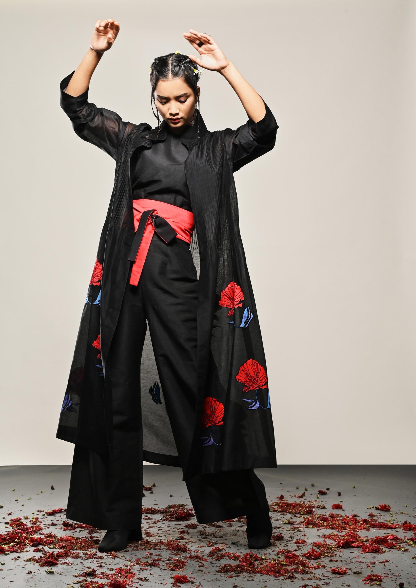 Black Chanderi Silk jacket pin tucked at yoke and appliqued with poppies worn with a cotton silk jumpsuit and obe belt .