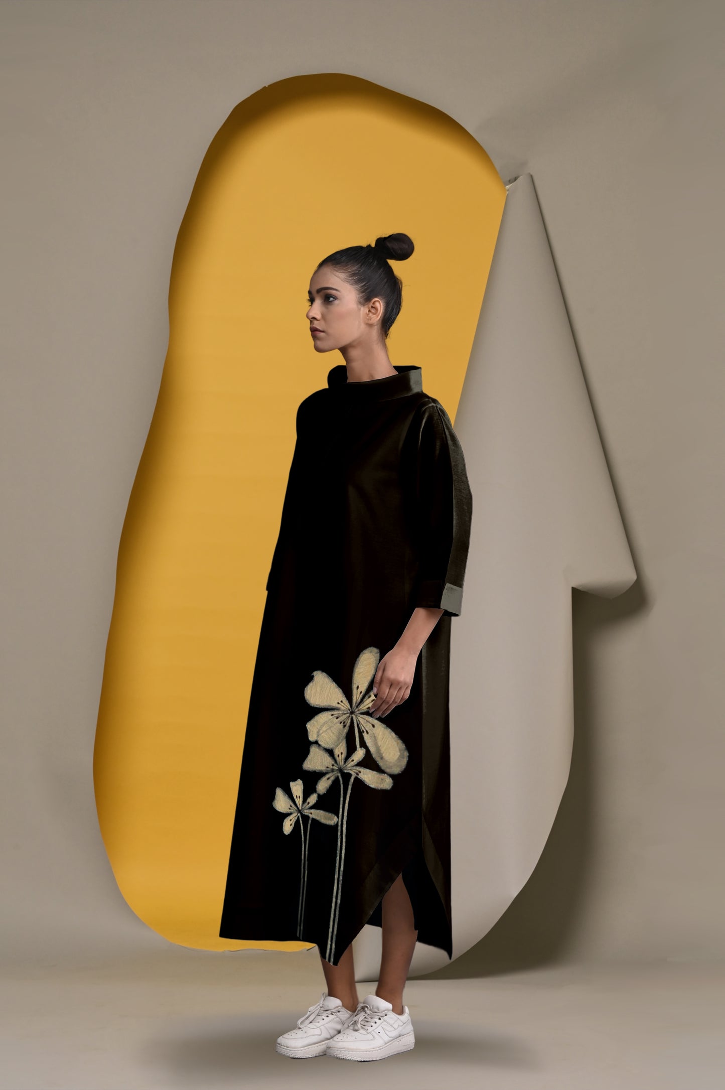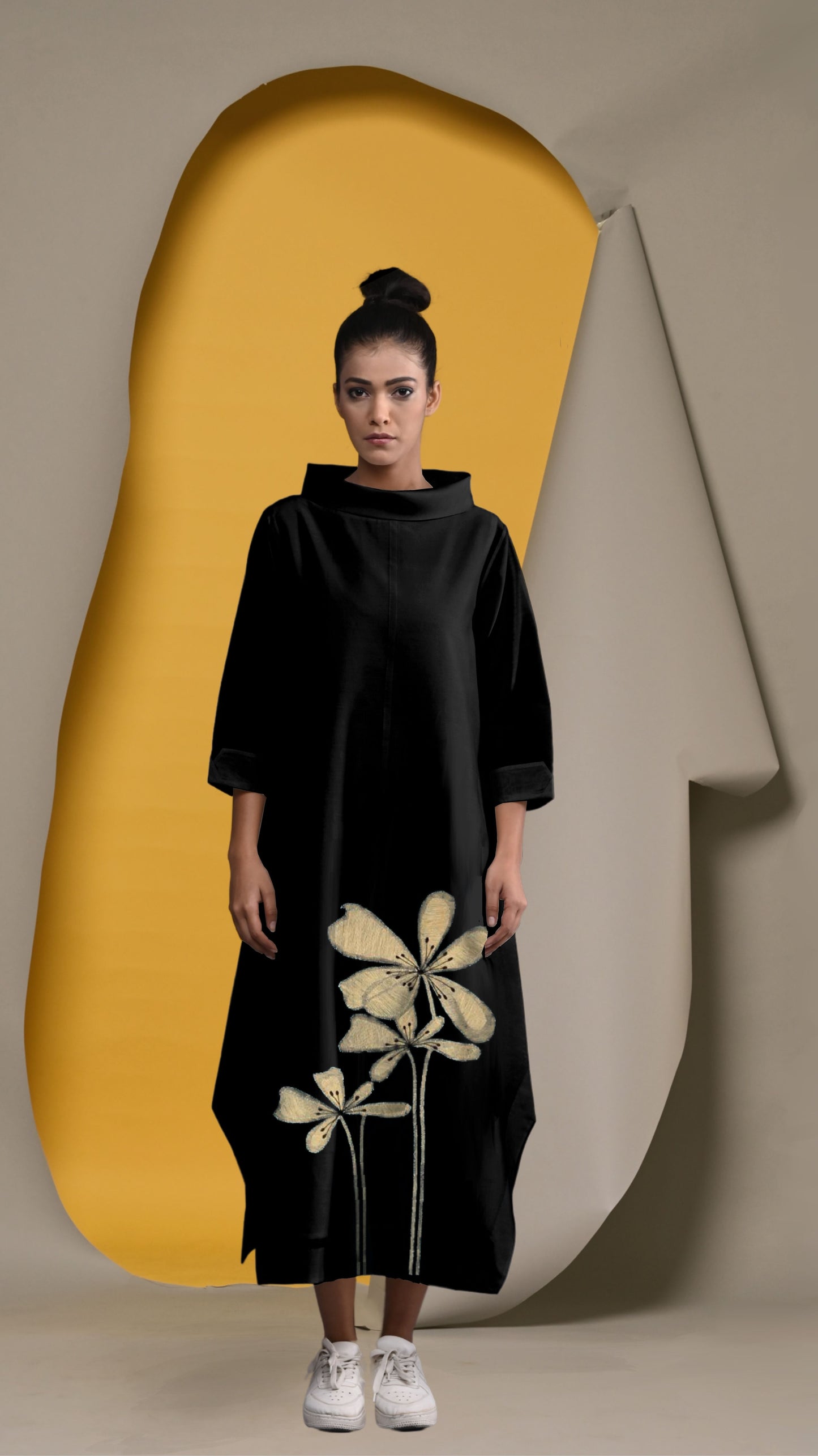 "A Cotton-Silk tunic dress with a gentle shimmer, embellished with delicate floral embroidery in lustrous gold metallic threads. Its asymmetrical hemline brings a modern, edgy vibe. This versatile piece can be worn with or without pants, offering a sleek, fashion-forward look for any occasion."