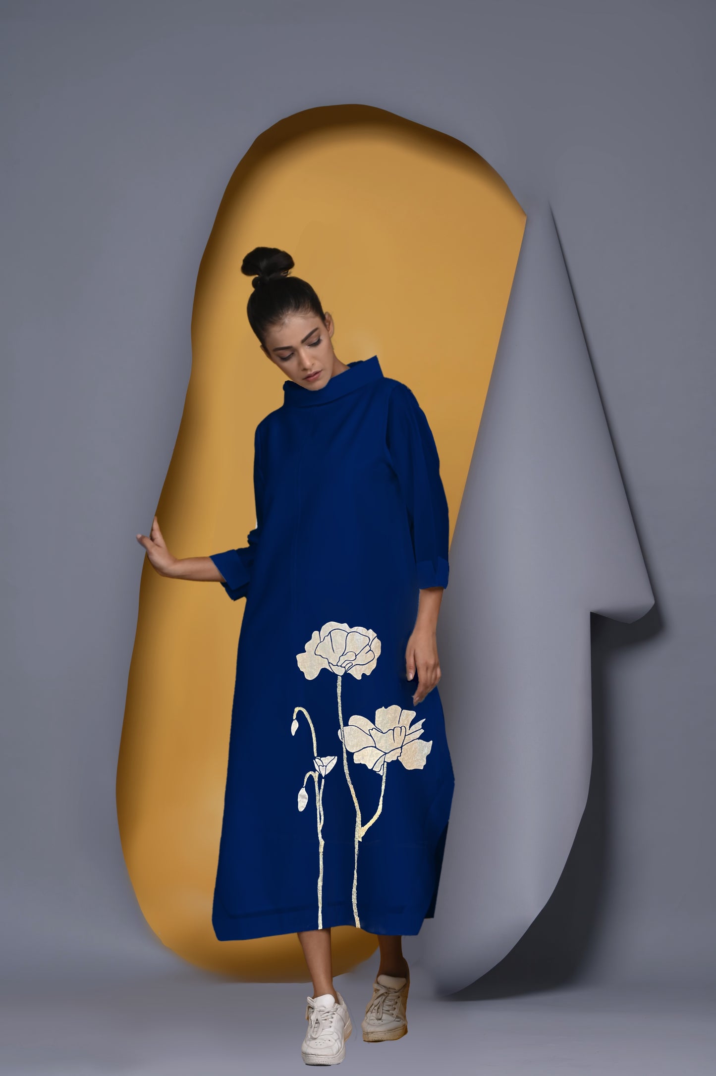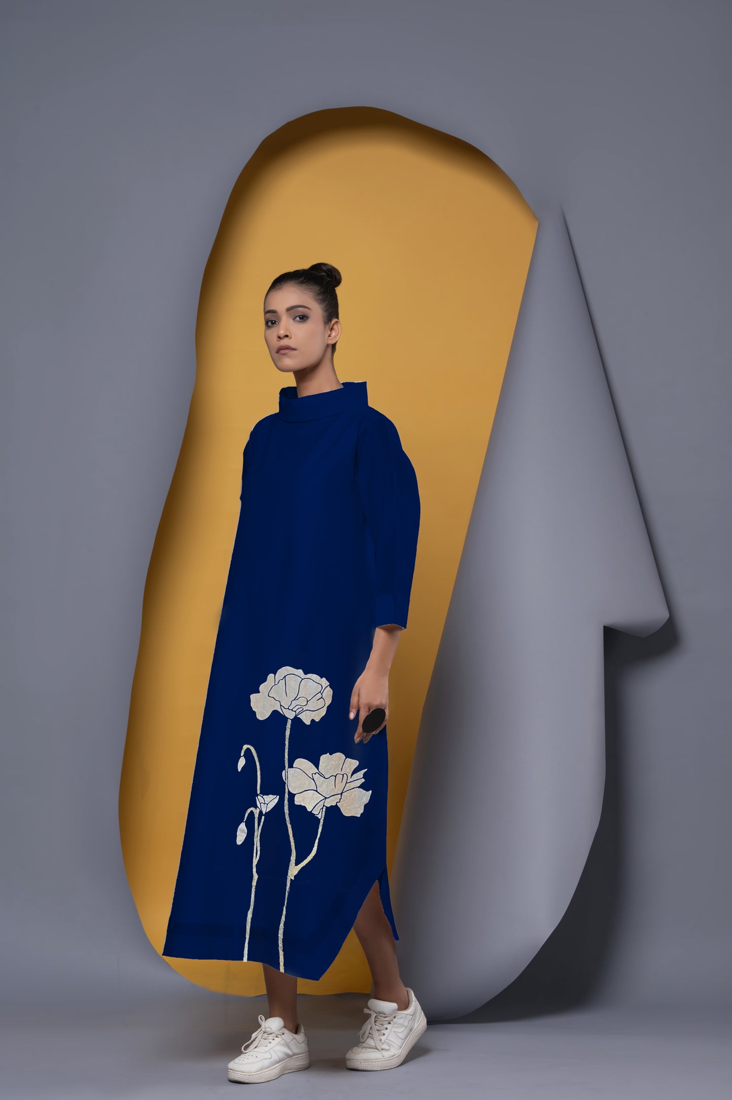 A jewel story cotton silk tunic dress that shimmers ever so slightly , mid-night blue cotton silk dress appliqued with silver carnation
