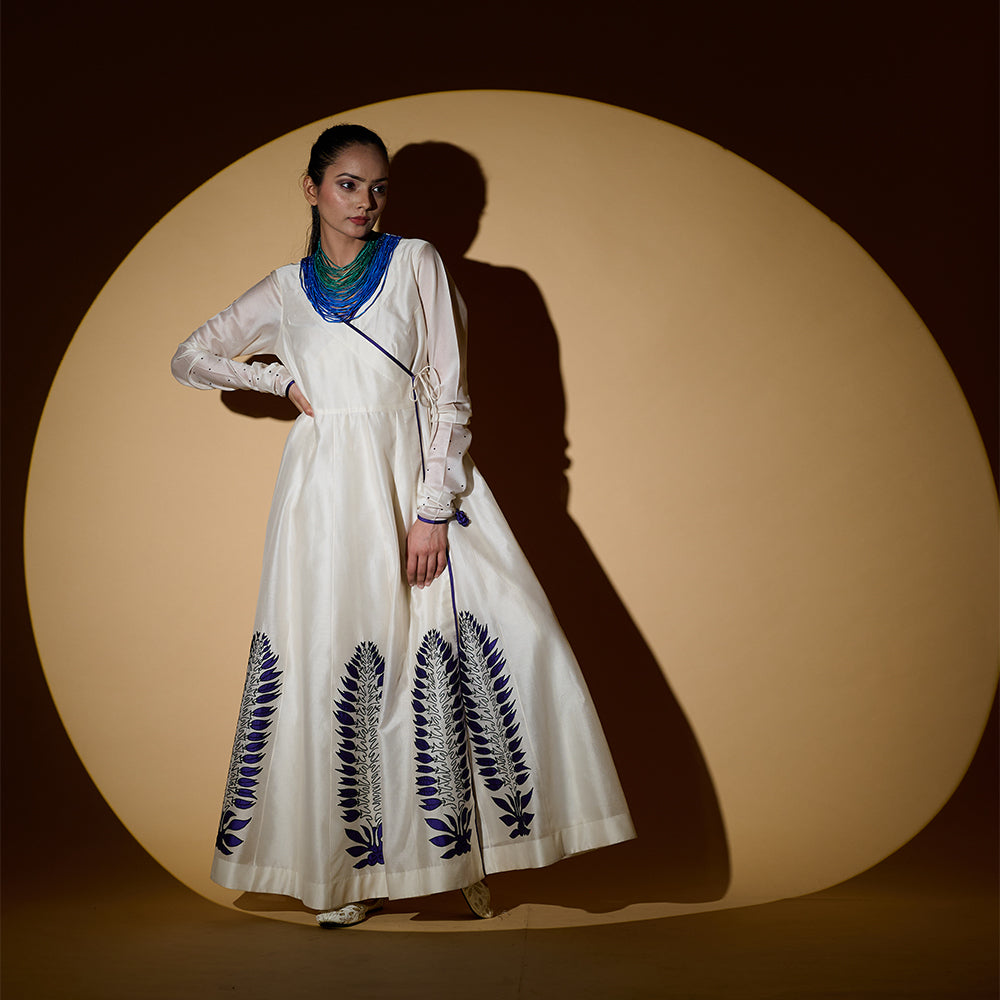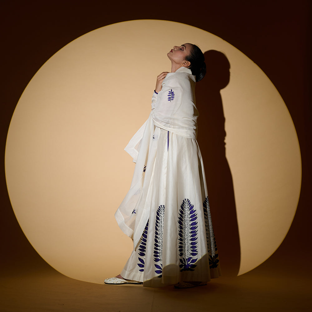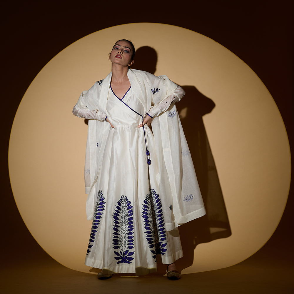 Ivory chanderi silk anarkali appliqued and embroidered in lapis lazuli paired with a lycra net churidar .