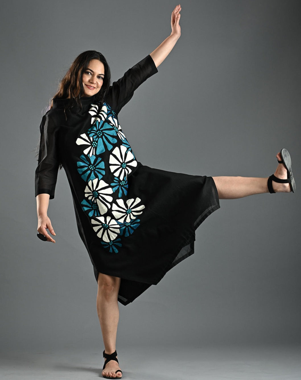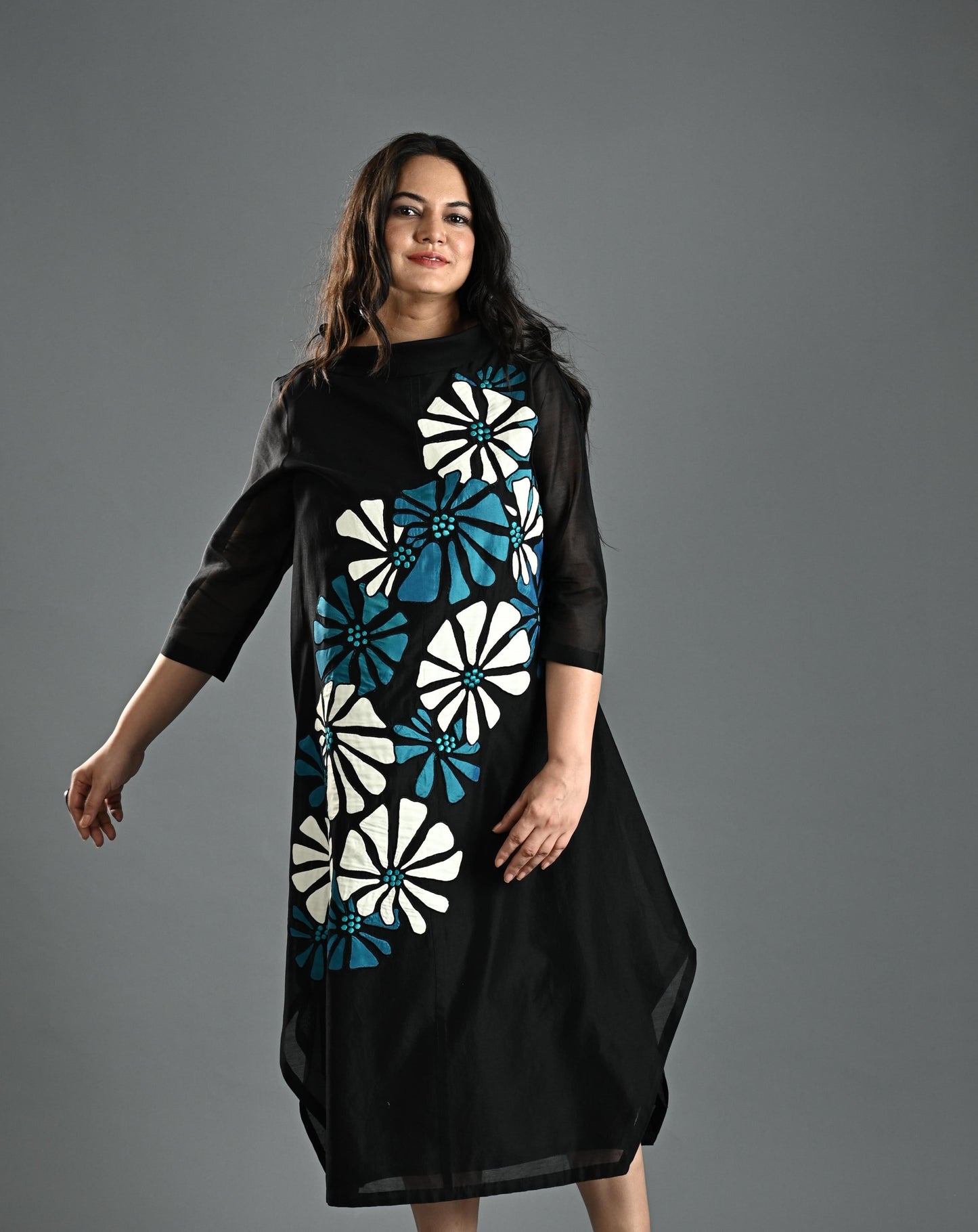 Black asymmetric dress appliqued with ivory and blue flowers .