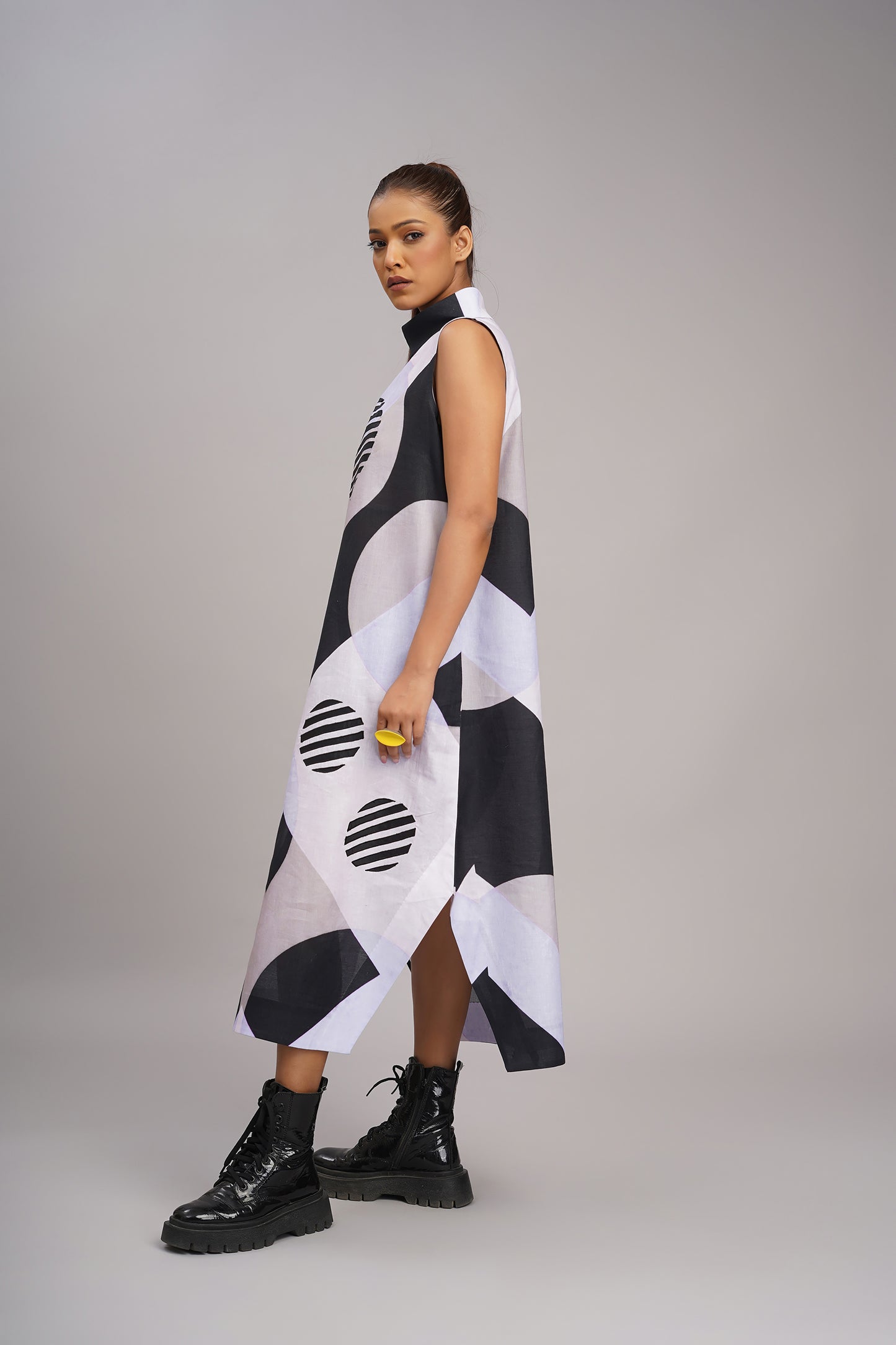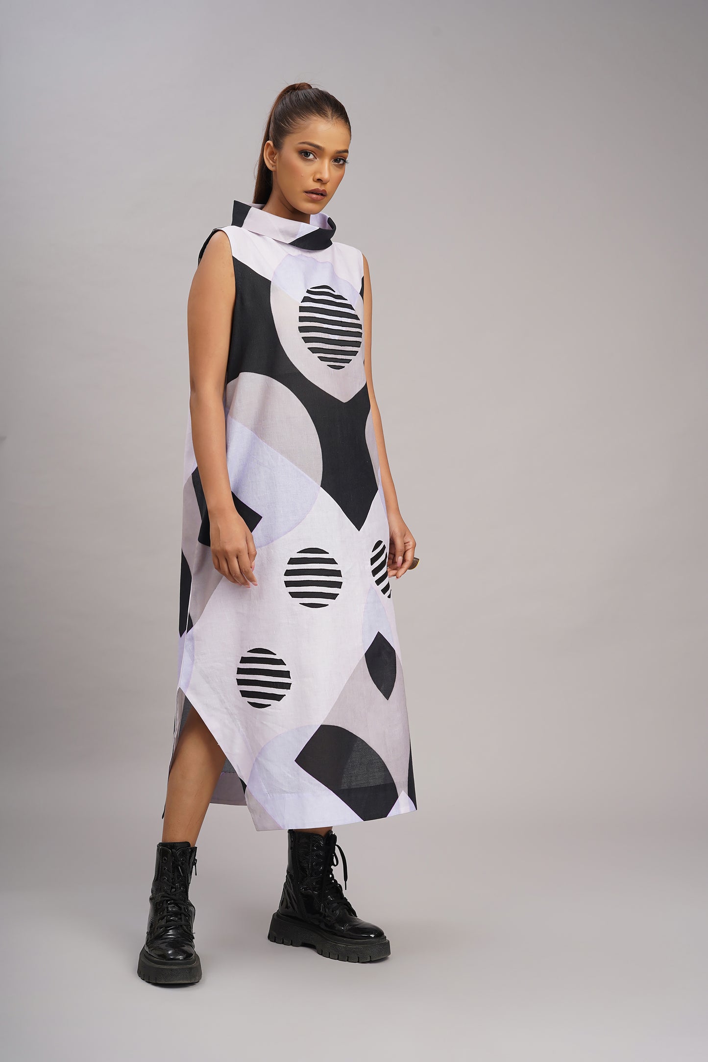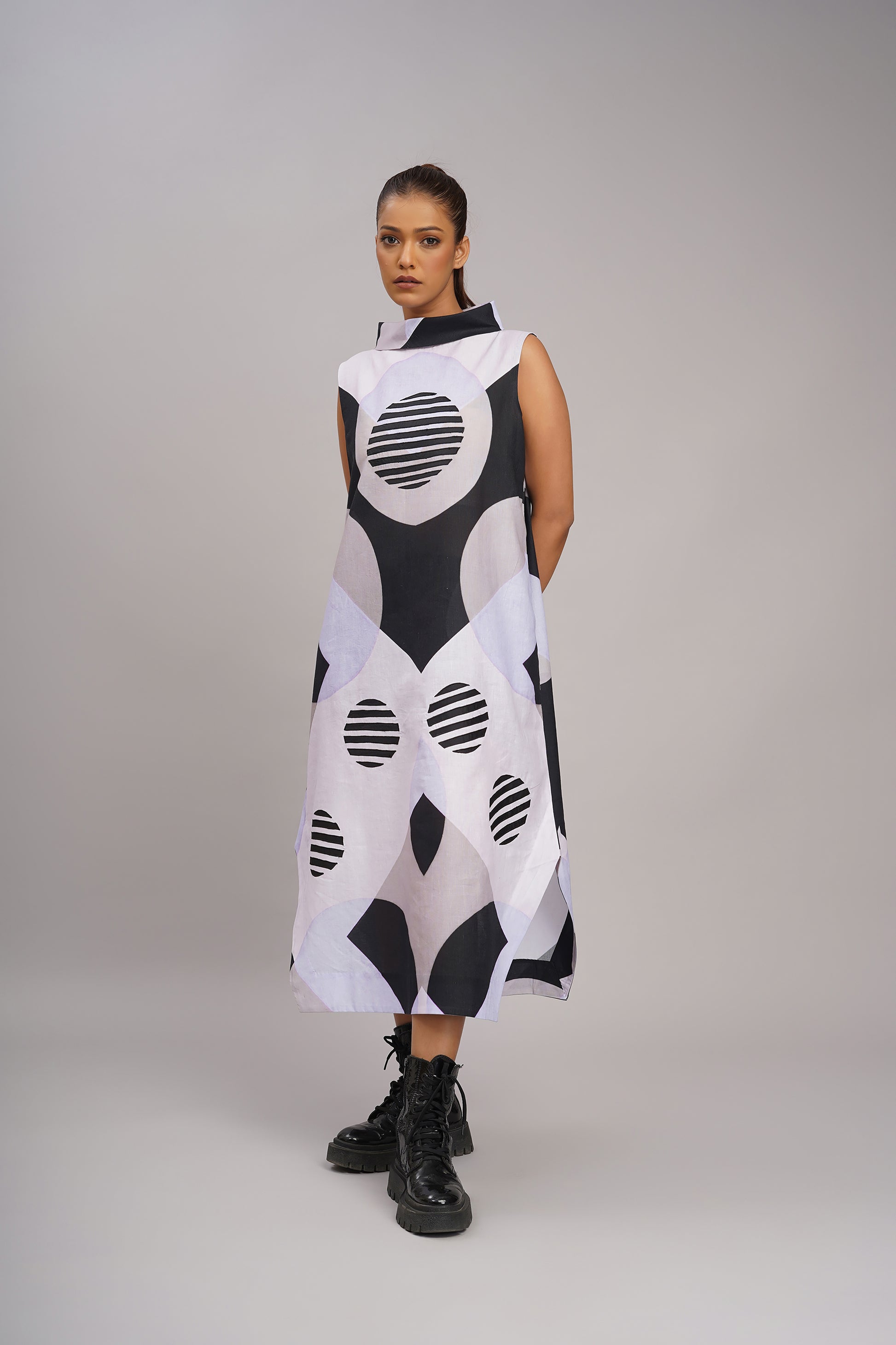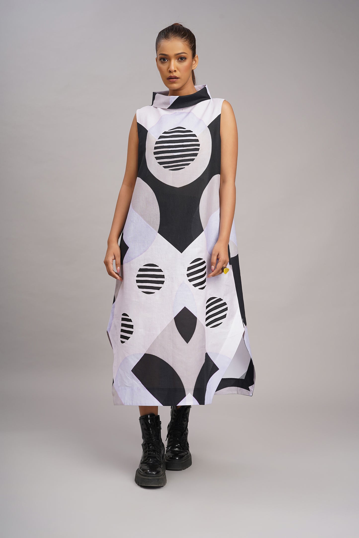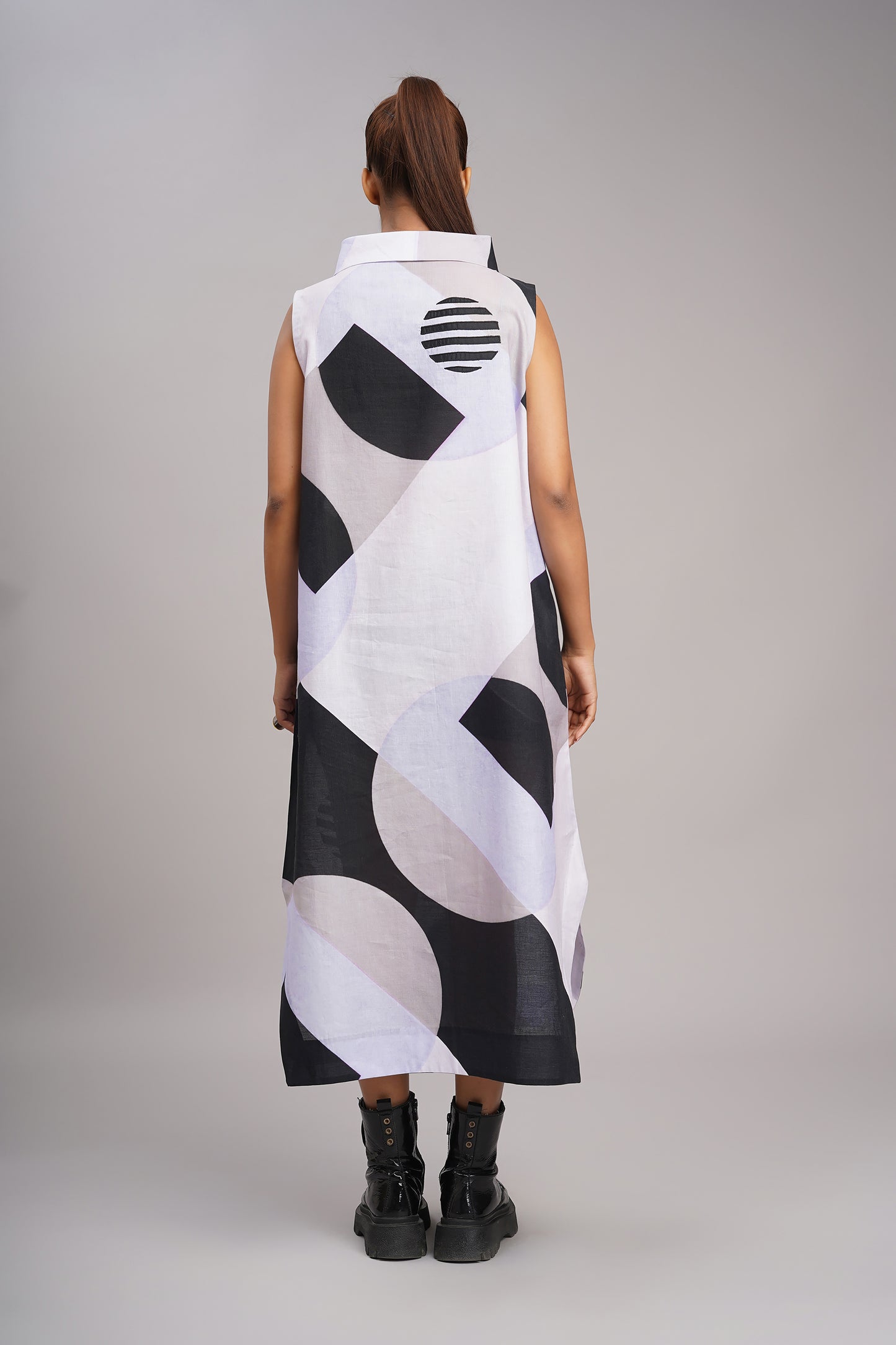 A modern, sculptural silhouette with a playful use of geometric patterns which creates a look that is artistic, contemporary, and a little futuristic, printed and embroidered dress.