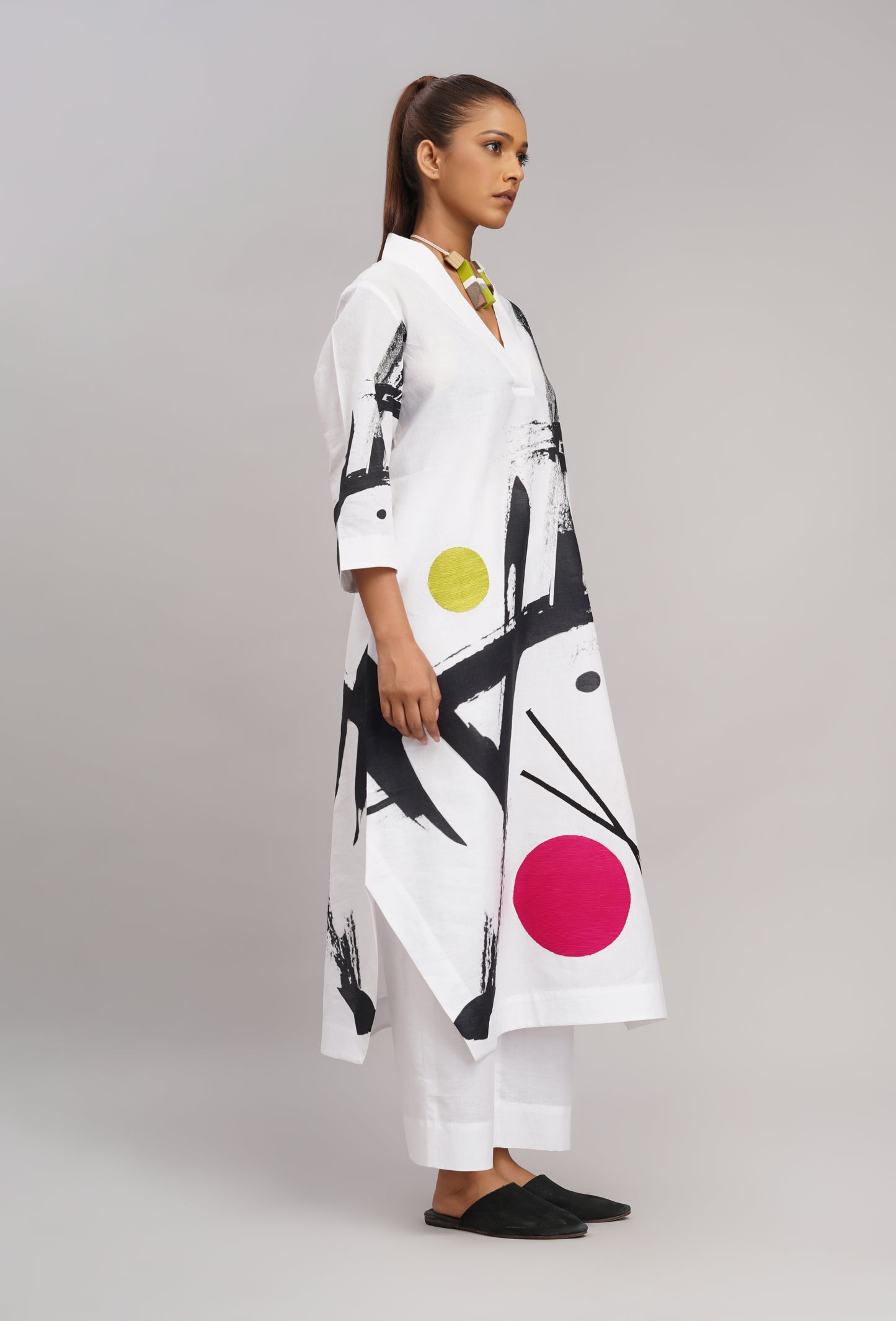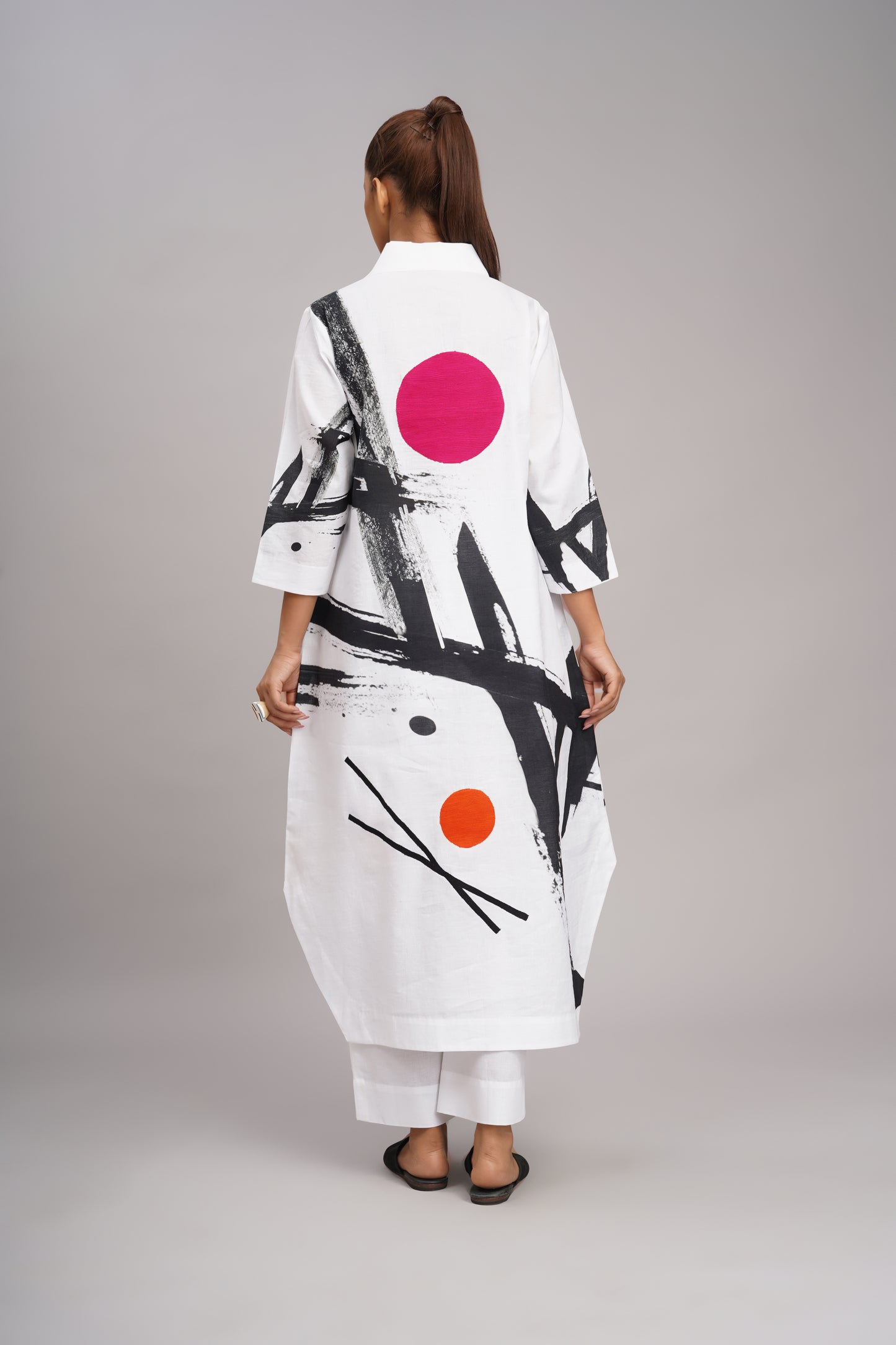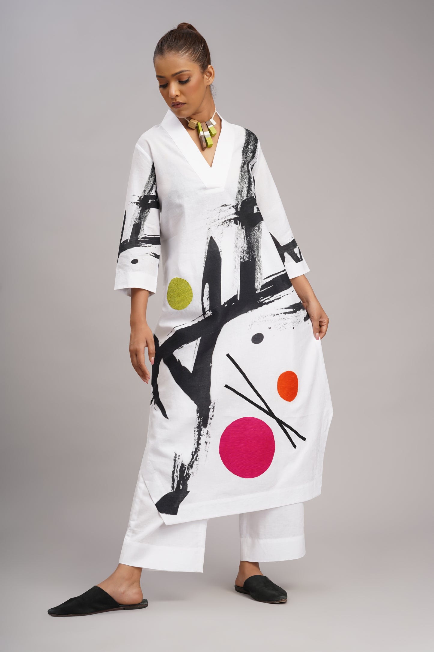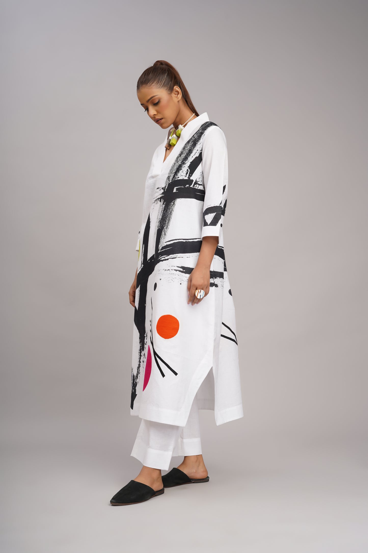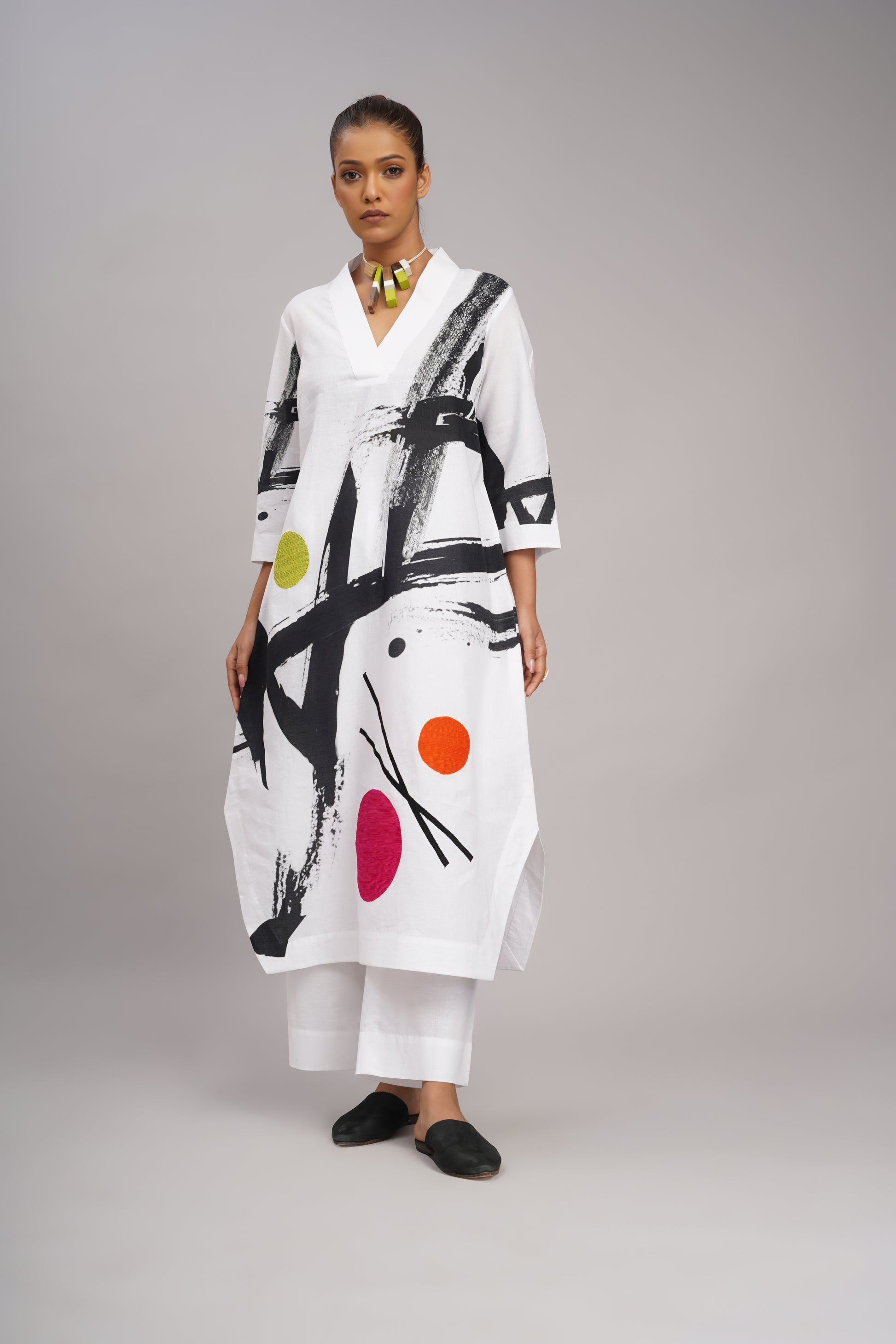 White linen printed and embroidered tunic with linen pant.