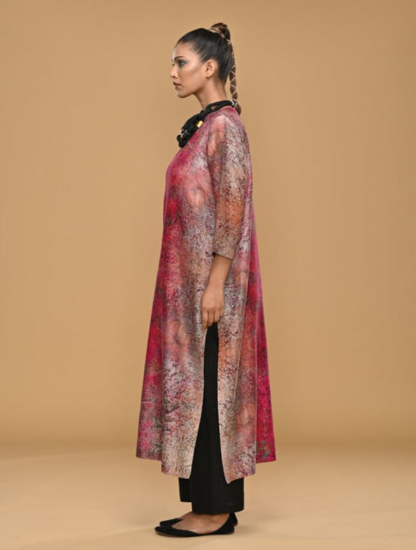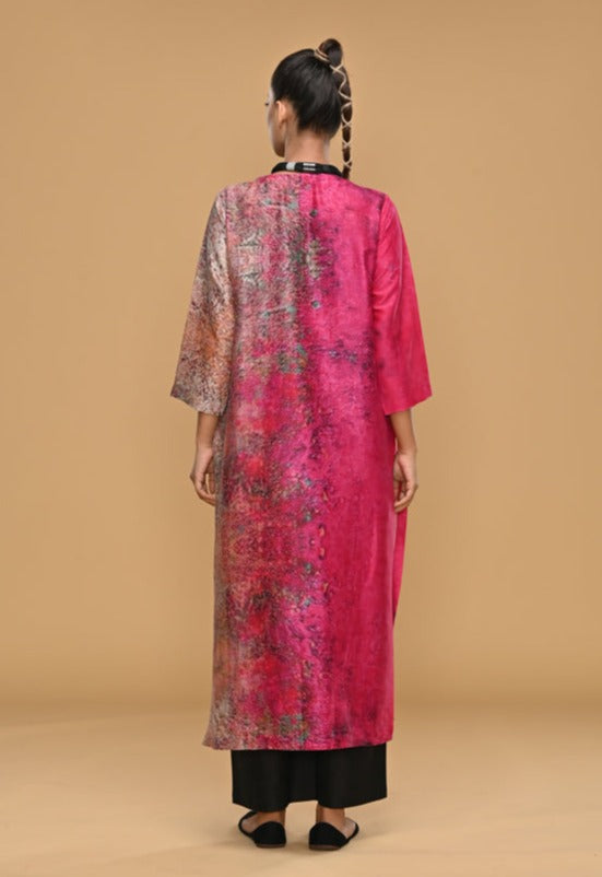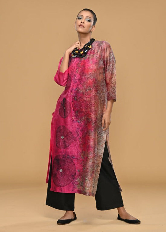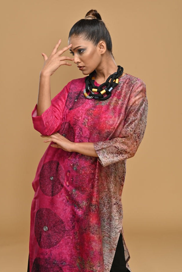 Printed tunic with embroidered spirals paired with black cotton silk pants .