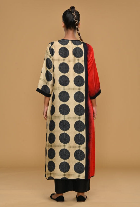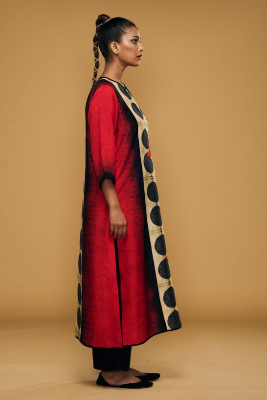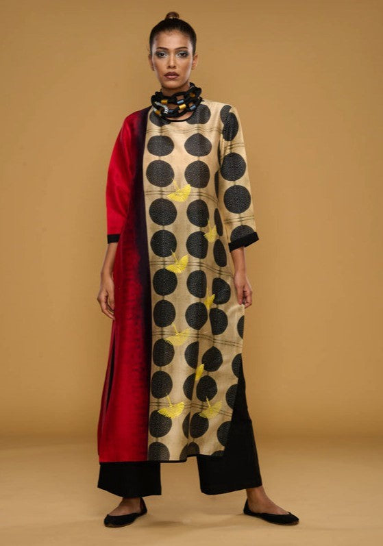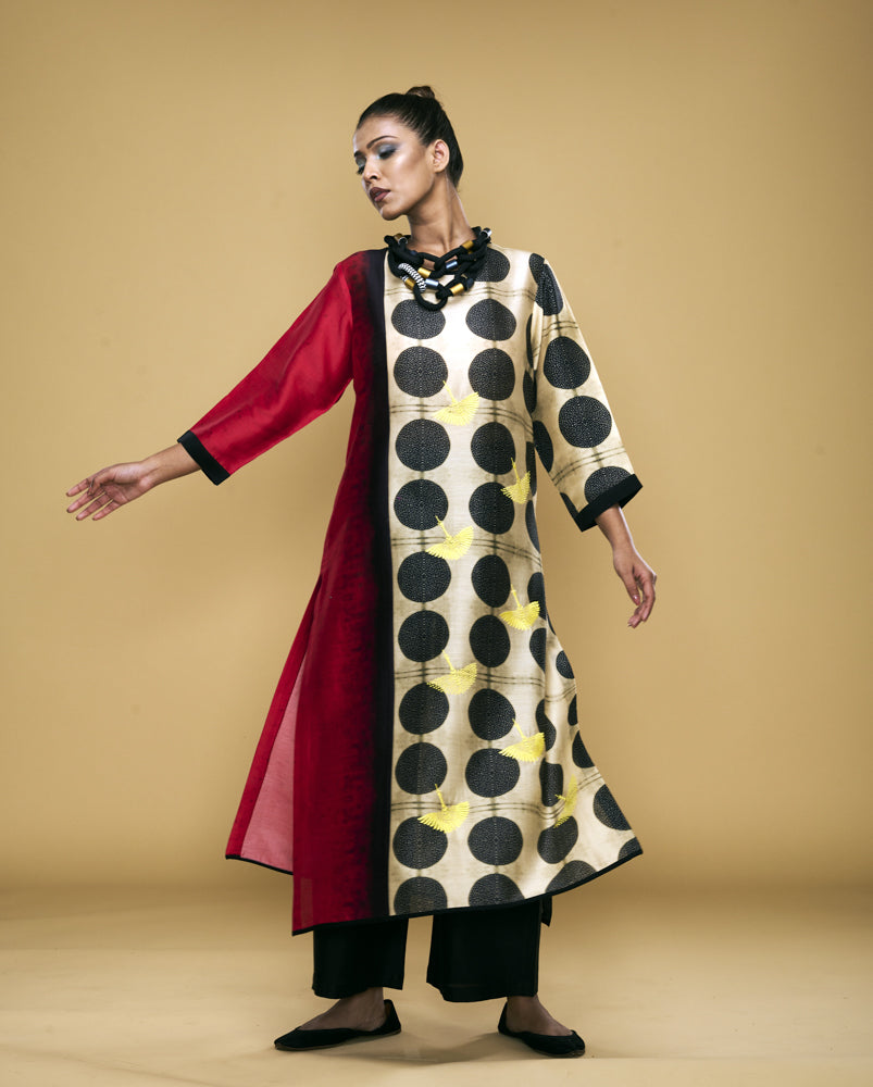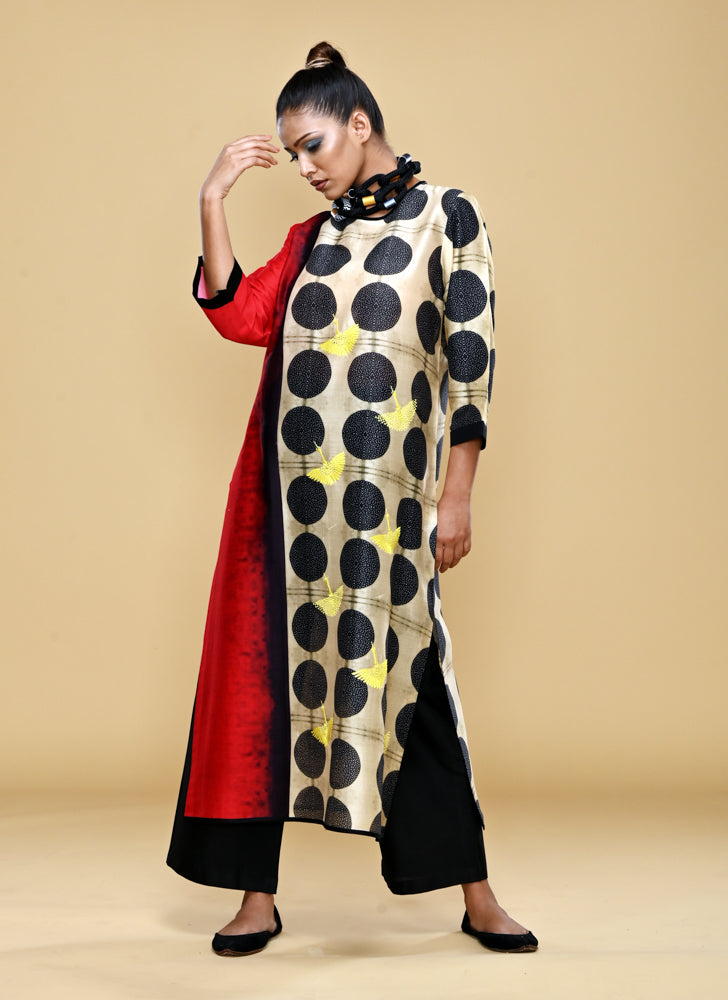 Red , Ivory and Black printed tunic with embroidered cranes paired with black cotton silk pants .