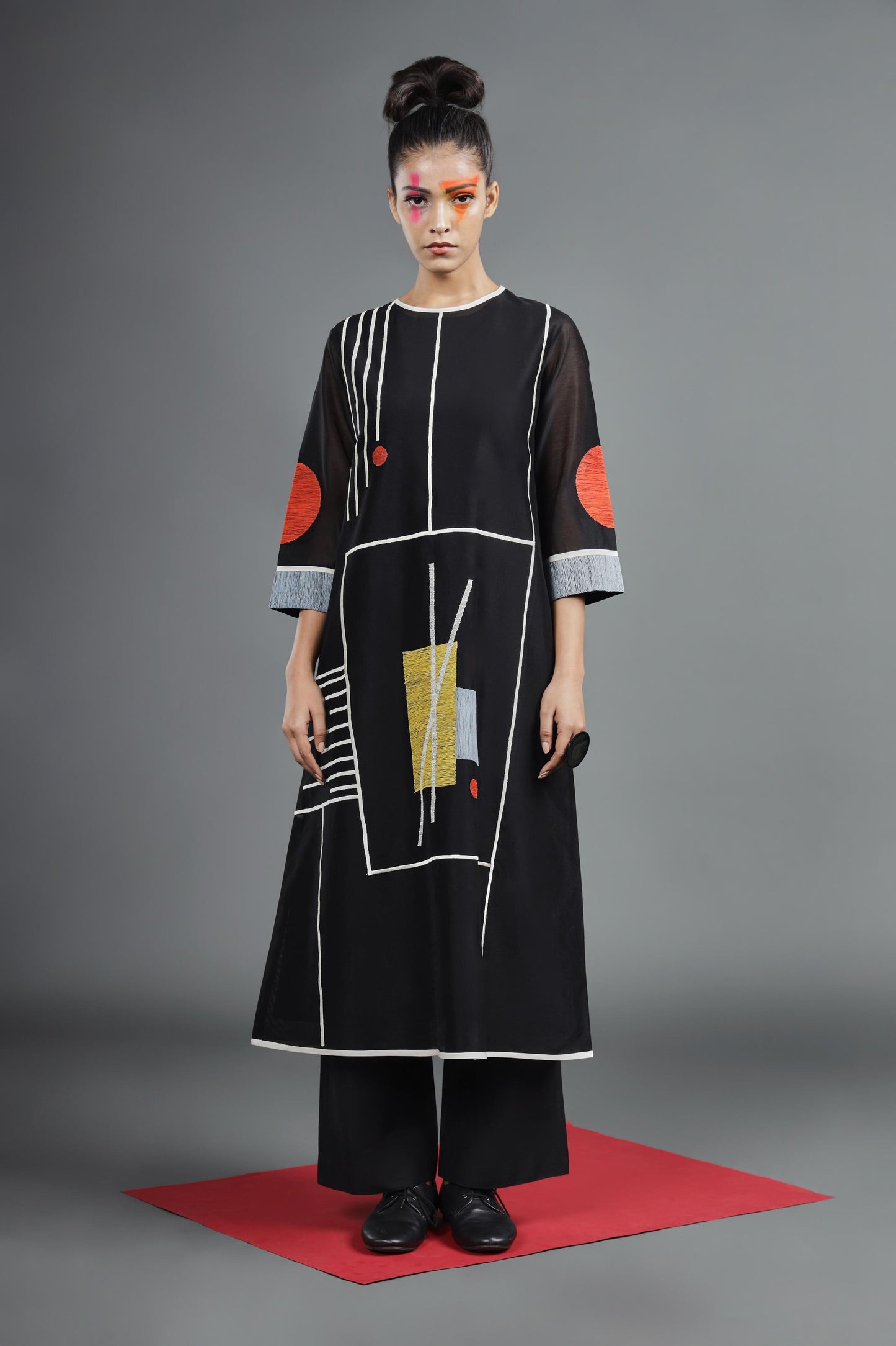 Quirky and fun , this black chanderi tunic and cotton silk pants set is embroidered with a geometric pattern inspired by the Bauhaus Design Movement and Japanese aesthetics .